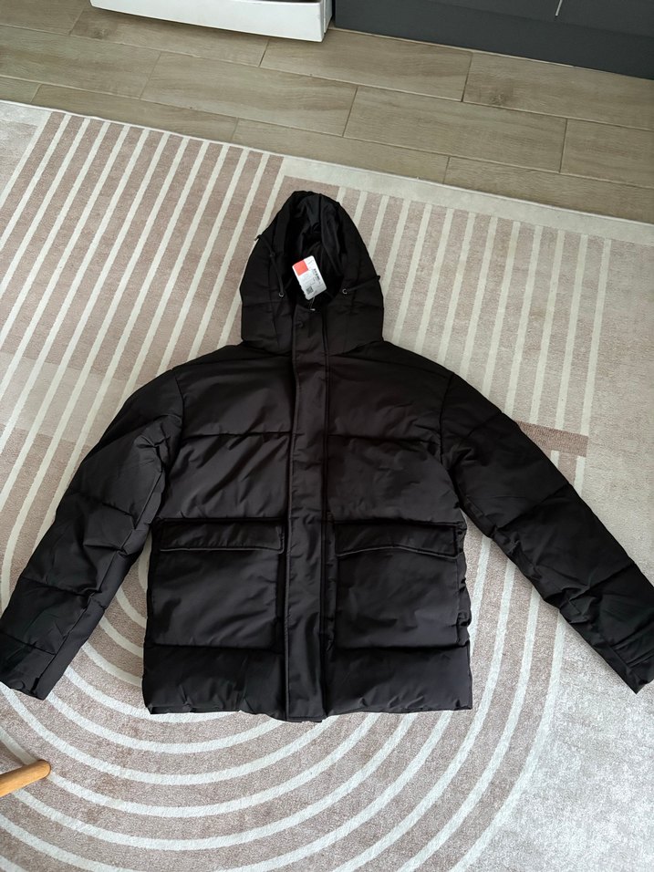 Siyah, kapüşonlu, fermuarlı cepli, uzun kollu, erkek kış montu. Yumuşak ve sıcak kumaştan, dış mekan kullanımına uygun.
