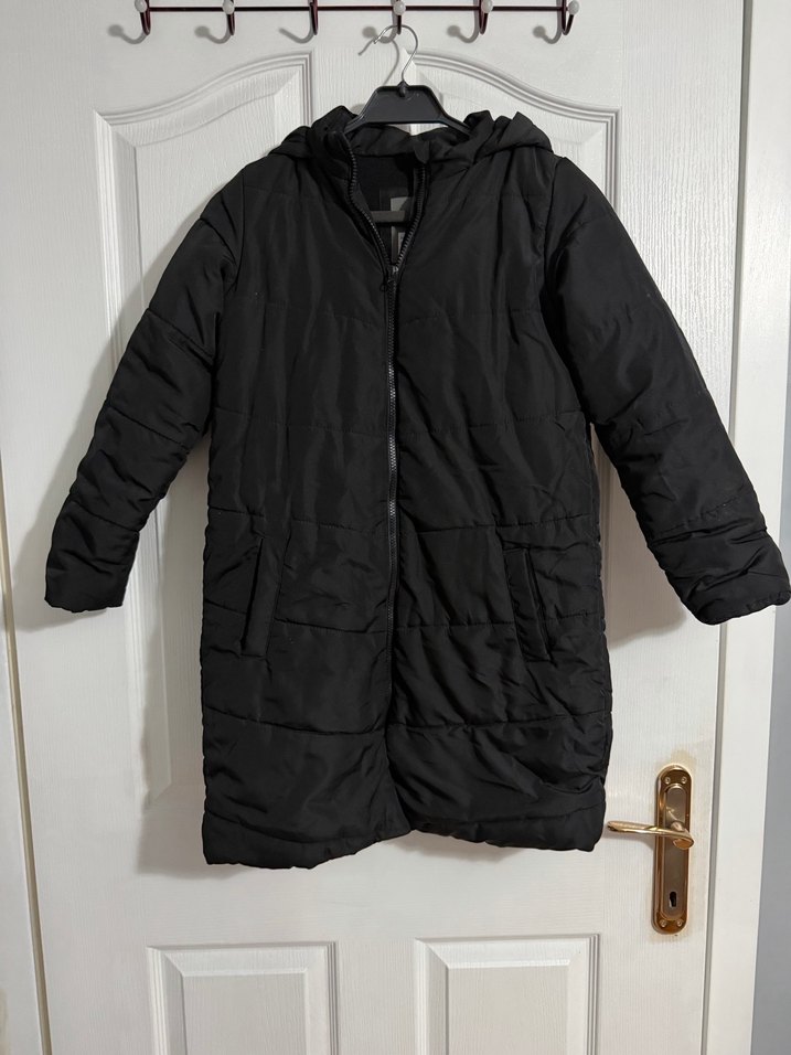 Siyah renkte, kapüşonlu ve fermuarlı önden kapanışlı, uzun kollu, midi boyda, yumuşak ve sıcak dokulu 9 / 10 yaş kışlık montu. Günlük kullanıma uygundur. ❄️