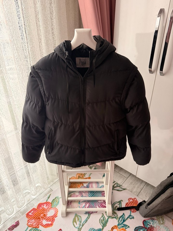 Bu siyah kapüşonlu kadın mont, kolları çıkarılabiliyor yüksek yakalı ve fermuarlı ön yapıya sahiptir. Uzun kollu ve kısa boyda, yumuşak fleece kumaştan üretilmiştir, günlük sokak stili için uygundur. İster yelek ister mont olarak kullanılabilir hiç bir kusuru yoktur çok az kullanıldı tertemizdir
