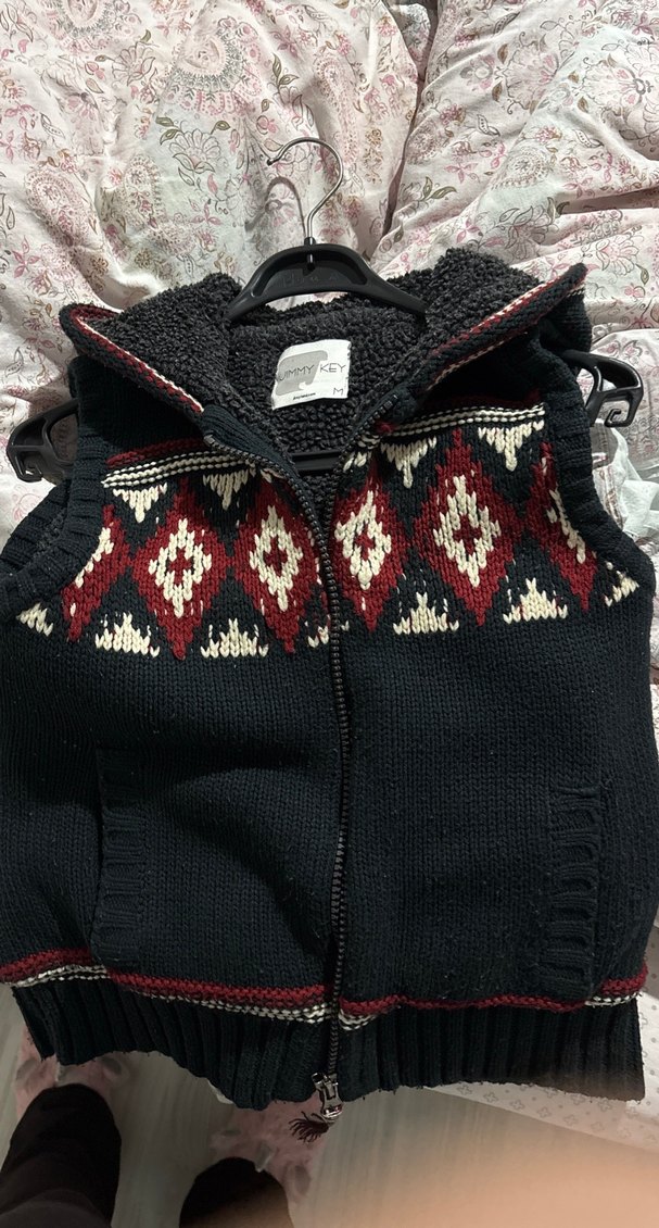 Fitted kesim, kapüşonlu siyah kadın süveter. Nakışlı geometrik desenlerle süslenmiş, kolsuz ve günlük kullanıma uygun rahat örgü kumaş.Vintage and cozy.
