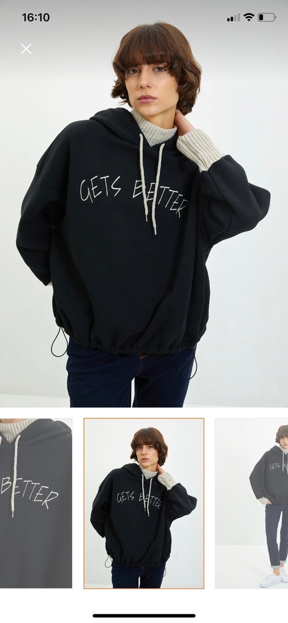 Siyah, yüksek yakalı, uzun kollu ve nakış detaylı, bol kesim sweatshirt. Yumuşak tüylü kumaştan üretilmiştir, günlük kullanıma uygundur. isteyene ürünün fotoğraflarını atabilirim 1-2 defa giydim