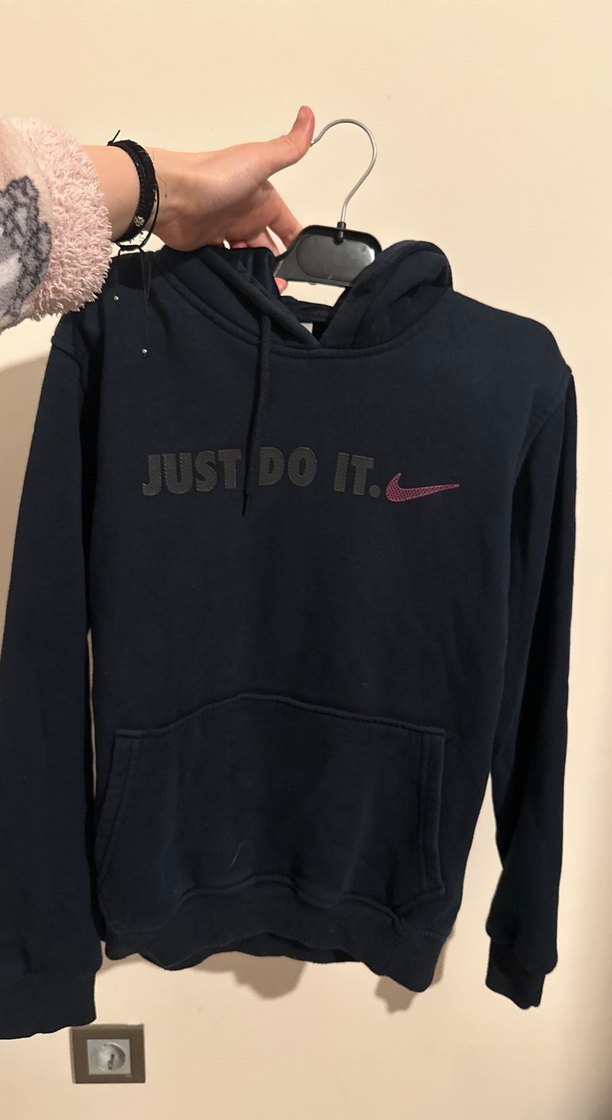 Siyah kapüşonlu, uzun kollu ve baskılı "JUST DO IT." yazılı Nike sweatshirt. Yumuşak, sıcak dokulu, günlük kullanım için uygun.
