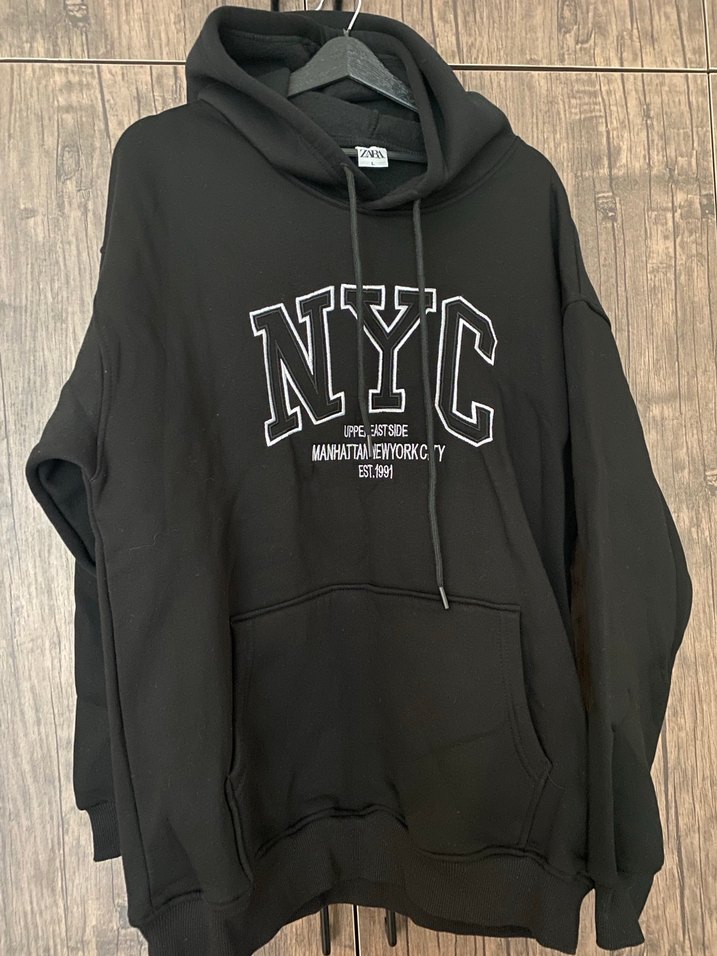Siyah kapüşonlu, uzun kollu, bol kesim sweatshirt. NYC baskısı ve ön cep detayı ile yumuşak ve sıcak kumaştan üretilmiştir.