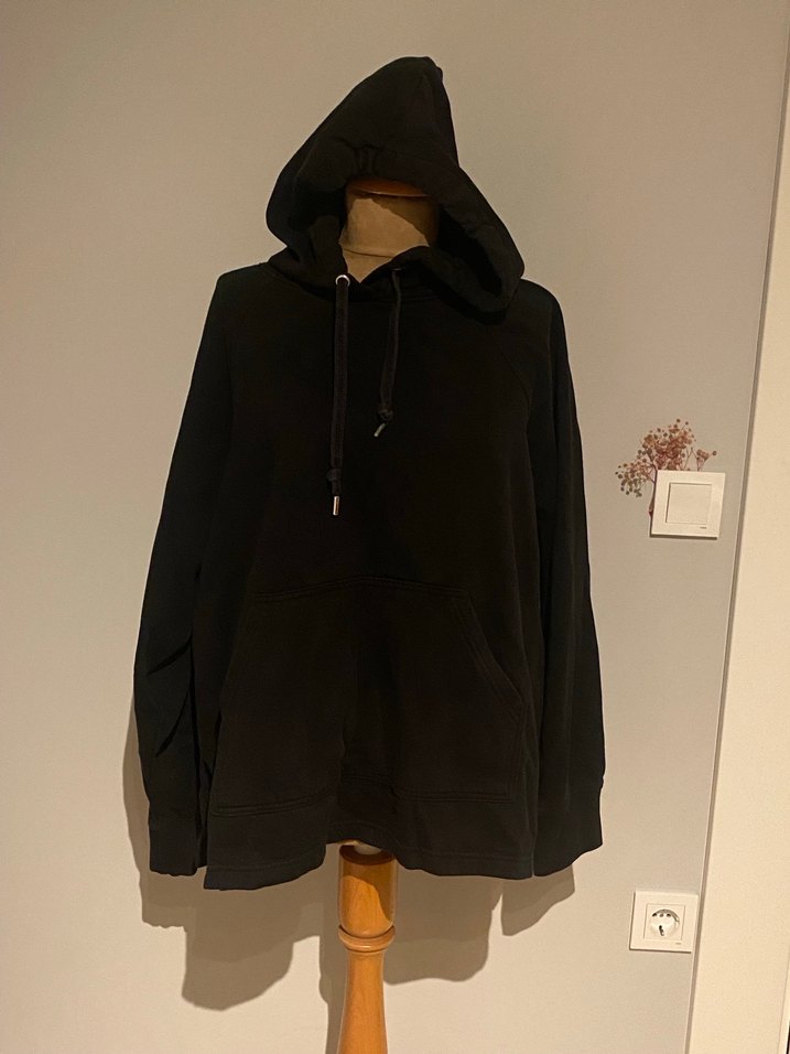 Yumuşak ve sıcak kumaştan, kapüşonlu, uzun kollu siyah oversize sweatshirt, günlük kullanıma uygun rahat bir stil sunar.