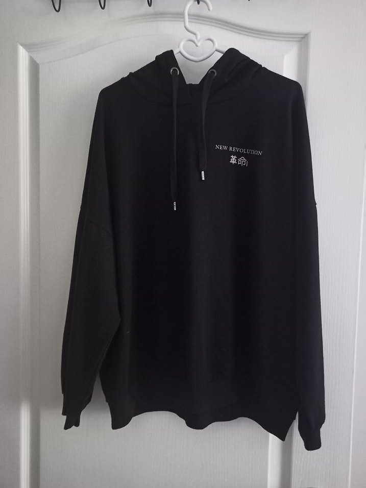 Uzun kollu, kapüşonlu ve oversize kesime sahip siyah sweatshirt, baskılı detayları ve yumuşak, sıcak kumaşıyla günlük kullanım için uygundur.