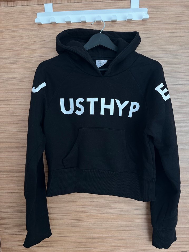 Siyah, uzun kollu, kapüşonlu ve oversize kesimli sweatshirt. Ön ve kollarda "JUSTHYPE" baskısı bulunur. Rahat kumaştan. Son iki fotoğrafta gördüğünüz çok küçük sökük var ama şardonlu olduğu için arkadan parmağım görünmedi arkadan sökğk değil ön kumaşı sökük gibi