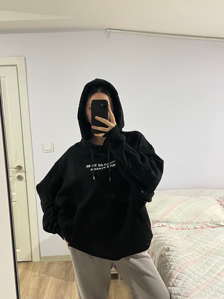 Siyah kapüşonlu sweatshirt, rahat oversize kesim ve baskılı desenle, yumuşak kumaştan günlük kullanım için uygundur. *Unisex ürün, markası Shout