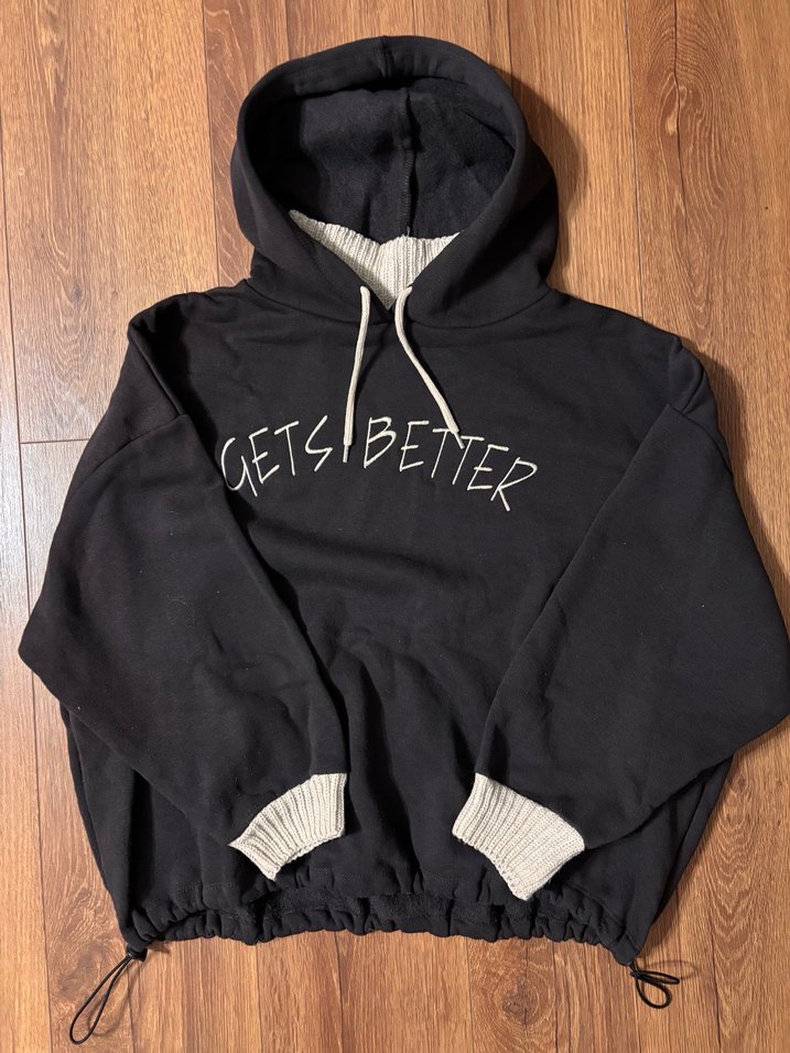Siyah kapüşonlu, uzun kollu ve bol kesim sweatshirt. Örme manşetlere ve "GETSIBETTER" baskısına sahiptir. Yumuşak ve sıcak kumaştan üretilmiştir.
