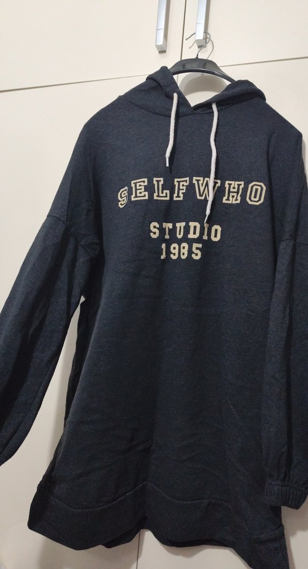 Siyah renkte, bol kesim, uzun kollu, bisiklet yaka ve kapüşonlu sweatshirt. Önünde "SELFWHO STUDIO 1985" baskısı bulunur. Günlük rahat stil için uygundur.