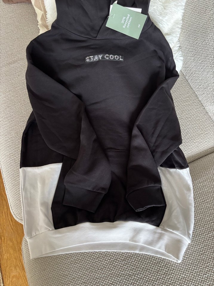 Pamuklu kumaştan siyah kapüşonlu sweatshirt, uzun kollu ve bol kesimdir. Göğüste gri "STAYCOOL" baskısı ve fermuarlı detay bulunur. Normal uzunlukta midi kesimdir.