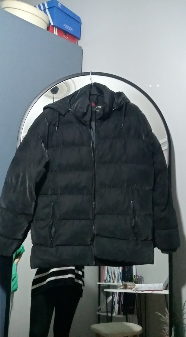 Siyah renkte, kapüşonlu ve uzun kollu, orta boy erkek kışlık mont. Fermuarlı ön ve cep detaylarıyla dış mekanlarda kullanıma uygun.sifir ürün hiç giyilmesi geniş kalıba sahip