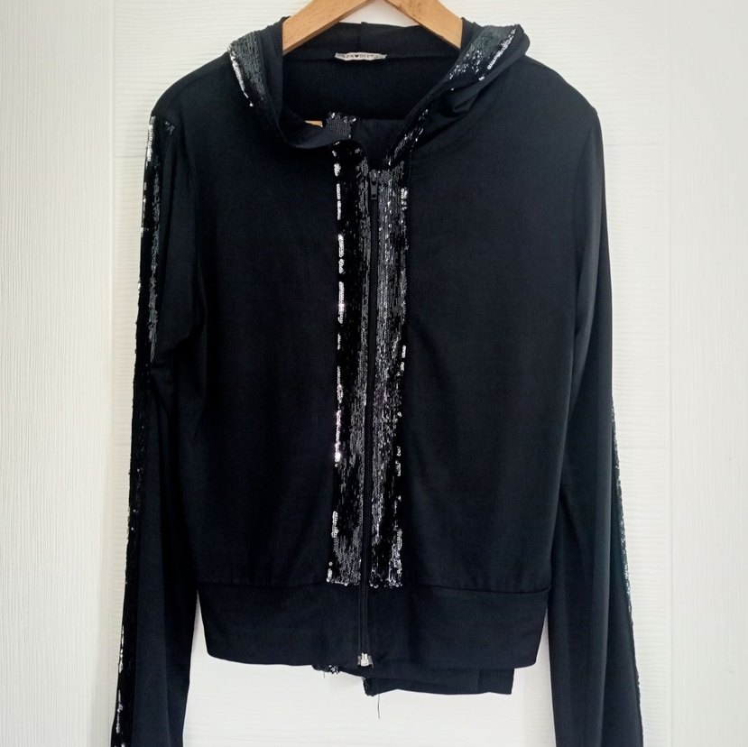 Siyah, kapüşonlu ve fermuarlı uzun kollu ve payet detaylıdır. Günlük kullanıma uygundur. Eşofman Takım .Marka öne çıkarmak için kullanılmıştır. 38/40 beden uyumlu.