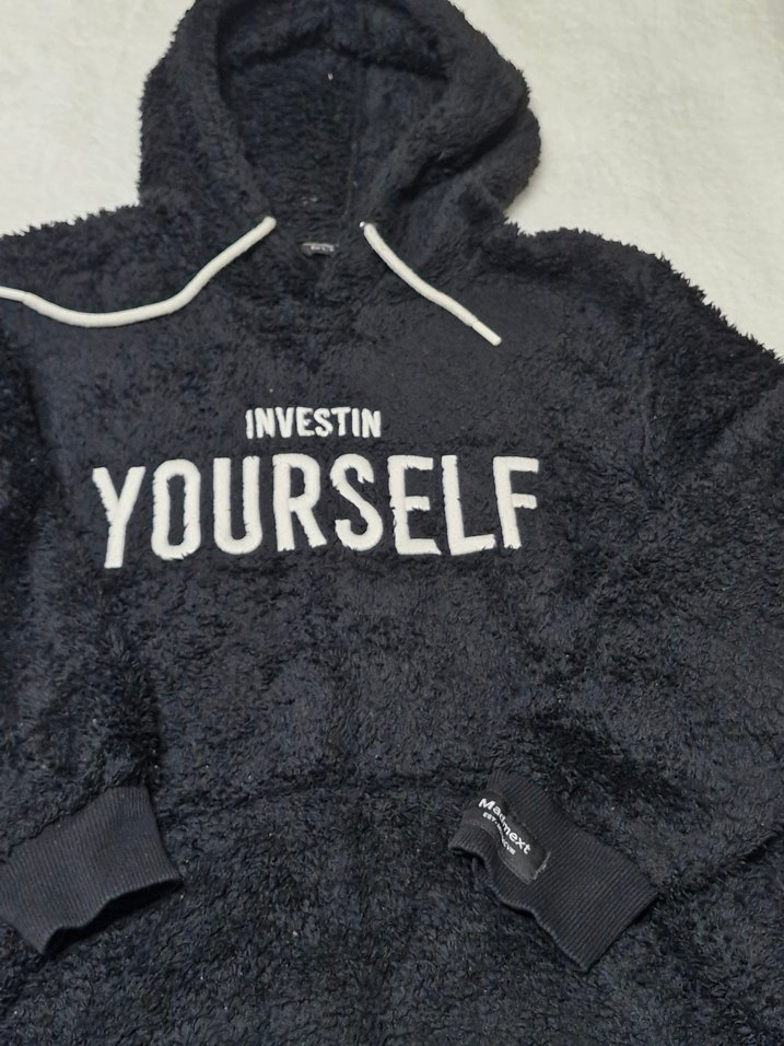 Siyah, kürk detaylı kapüşonlu sweatshirt, bol kesim ve uzun kolludur. Kısa boyda olup önünde 'INVESTIN YOURSELF' baskısı vardır. Rahat ve yumuşak kumaşlıdır.