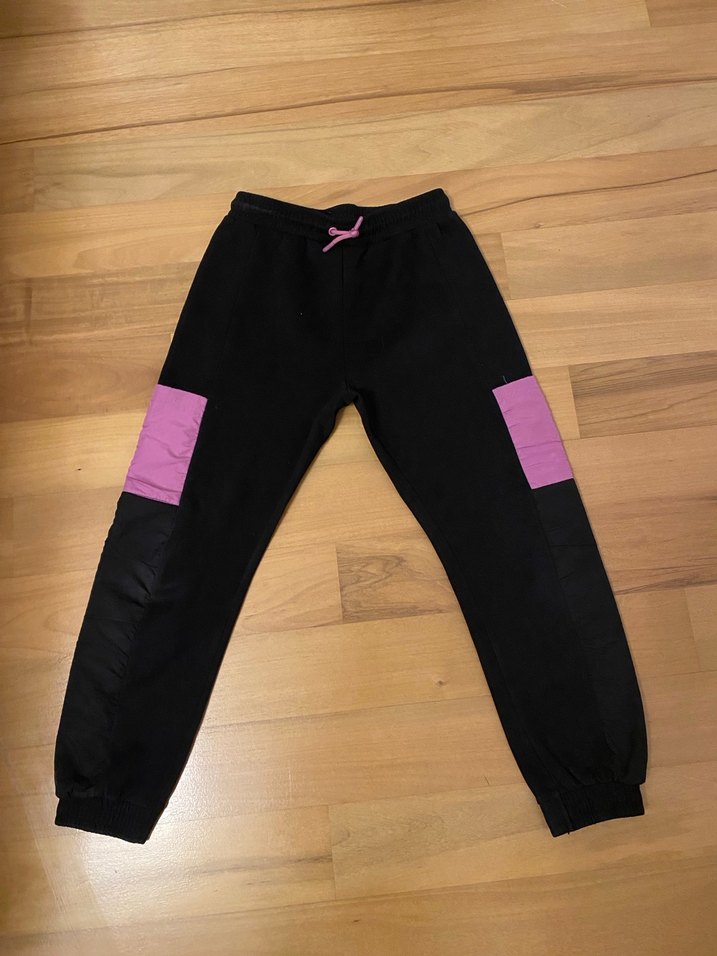 Yumuşak ve sıcak kürk kumaştan, bacaklarda pembe cırt cırt detaylı, bol kesim siyah eşofman altı. Dış mekan gündelik kullanıma uygundur.