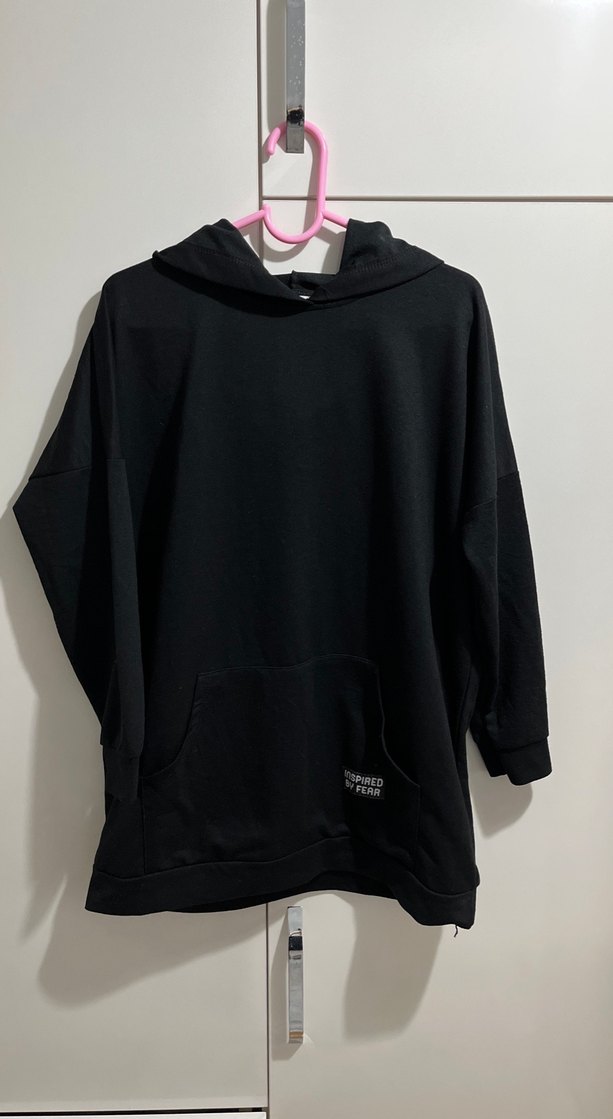 Siyah kapüşonlu sweatshirt, uzun kollu ve rahat kesim. Yumuşak ve sıcak kumaştan, midi boyda, desen içermeyen şık bir tasarım. Herhangi bir tiftiklenme yoktur, az kullanıldı, L bedene de olacak kalıba sahip