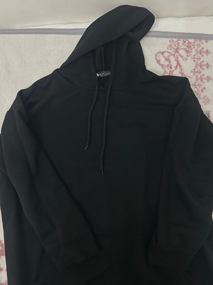 Siyah kapüşonlu, uzun kollu ve rahat kesim sweatshirt. Erkek kız farketmez giyilir unisex X-XL bedendir
