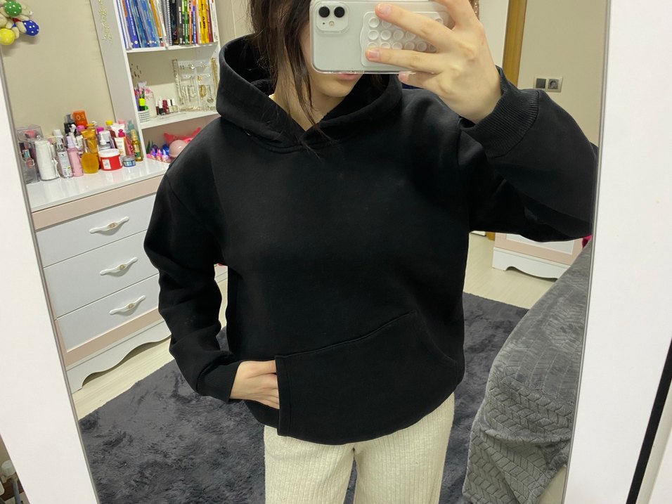 Siyah, uzun kollu, yuvarlak yakalı ve bol kesim sweatshirt. Yumuşak ve sıcak kumaştan üretilmiş, günlük kullanıma uygun rahat ve şık bir parça.