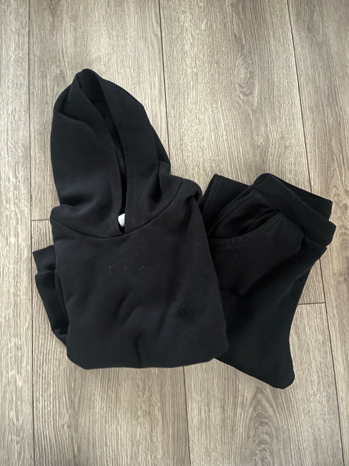 Siyah kapüşonlu sweatshirt ve pantolon seti, rahat kesim ve uzun kollu, yumuşak ve sıcak kumaştan. Düz tasarımıyla sokak modasına uyum sağlar.
