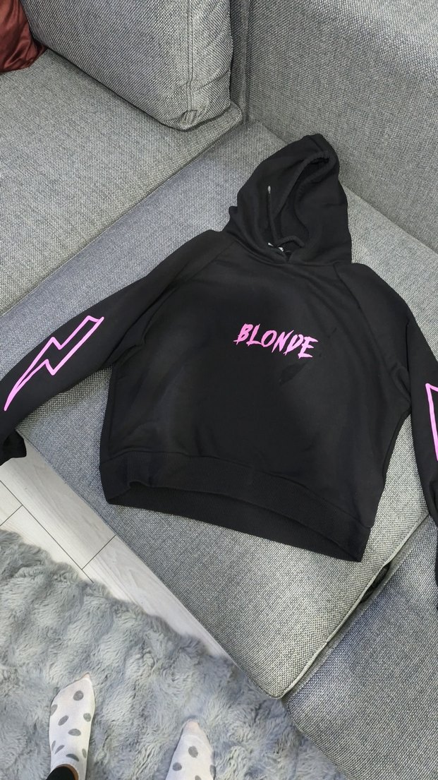 Siyah kapüşonlu, pembe baskılı ve fermuarlı detaylara sahip, bol kesim uzun kollu sweatshirt. Bisiklet yaka tasarımı rahatlık ve şıklık sunar. Sokak stili ve spor için uygundur.