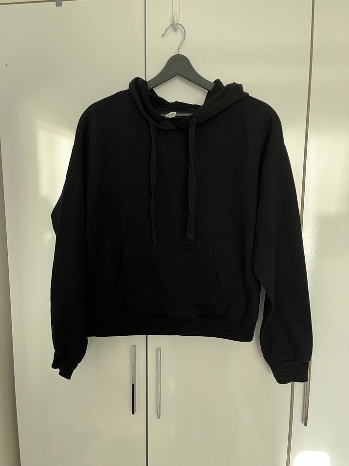 Siyah kapüşonlu sweatshirt, uzun kollu ve salaş kesimdir. Yumuşak ve sıcak kumaştan üretilmiştir, günlük kullanım için uygundur.