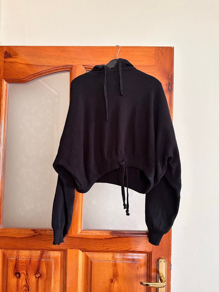 Siyah kapüşonlu sweatshirt, uzun kollu ve midi boydadır. Yumuşak, sıcak kumaştan yapılmış, rahat ve şık bir görünüme sahiptir.
