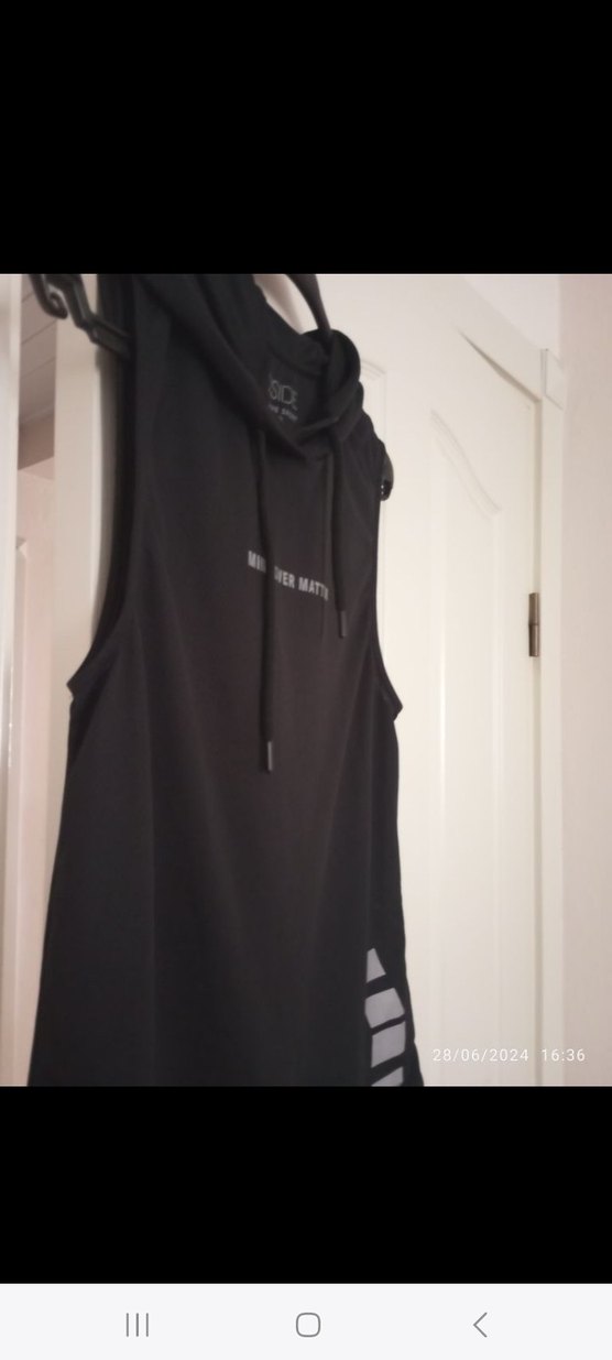 Siyah, kapüşonlu, kolsuz, yüksek yakalı ve baskılı detaylara sahip midi boyda, dar kesimdir. Sentetik kumaştan üretilmiş, spor ve sokak tarzını birleştirir. Rahat ve şık görünüm sunar.
