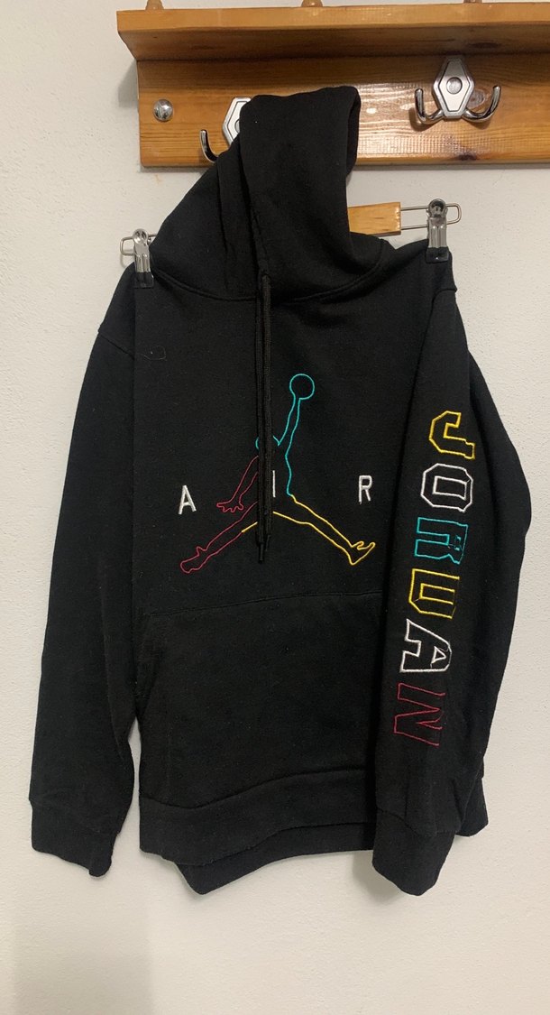 Siyah kapüşonlu, uzun kollu erkek sweatshirt. Rahat kesim ve baskılı tasarıma sahip. Fermuarlı ve yumuşak kumaftan yapılmış. Kolunda renkli 'JORDAN' yazısı bulunur.