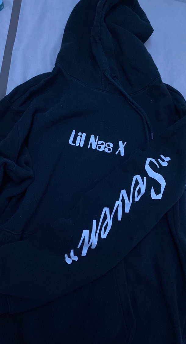 Siyah kapüşonlu sweatshirt, uzun kollu ve bol kesim. "Lil Nas X" baskılı, rahat ve günlük kullanım için uygun.