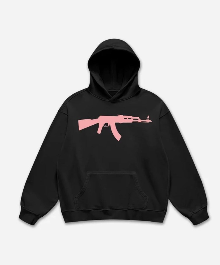 Siyah kapüşonlu sweatshirt, uzun kollu ve rahat kesimlidir. Önünde pembe baskılı silah deseni bulunur. Yumuşak ve sıcak kumaştan yapılmıştır, günlük kullanıma uygundur.