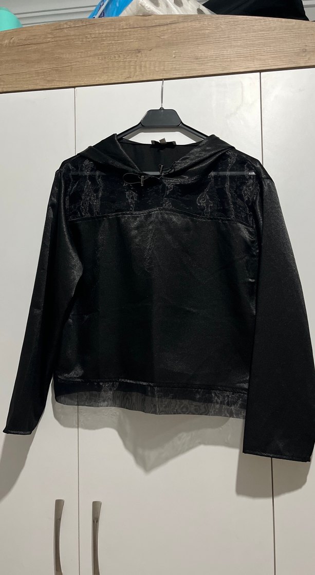 Siyah Kapüşonlu tül saten bluz