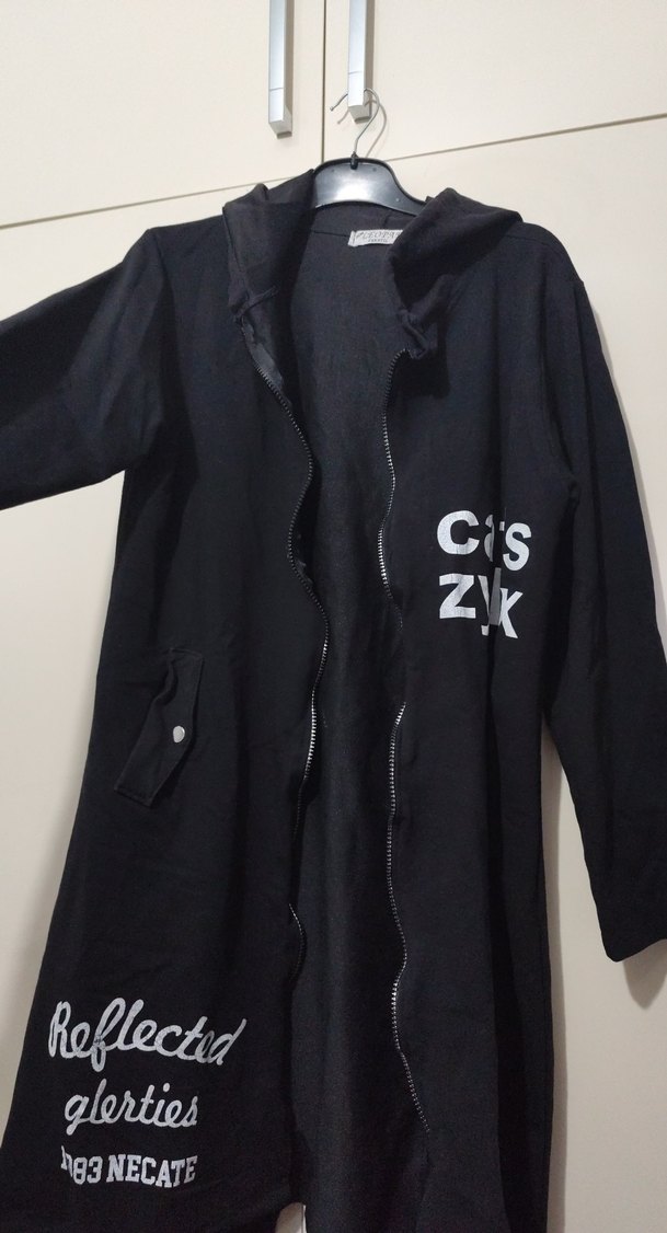 Siyah uzun ve fermuarlı ceket, yumuşak ve sıcak kumaştan. Notlu yaka ve bol kesim ile sokak tarzına uygun baskılı detaylar içerir.