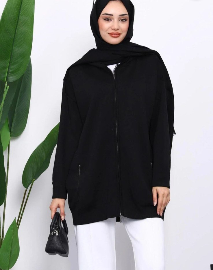 Siyah renkli, kapüşonlu ve fermuarlı uzun kadın ceketi. Bol kesim ve uzun kollu, yumuşak ve sıcak kumaştan, sokak stiline uygun. sıfır ürün etiketli