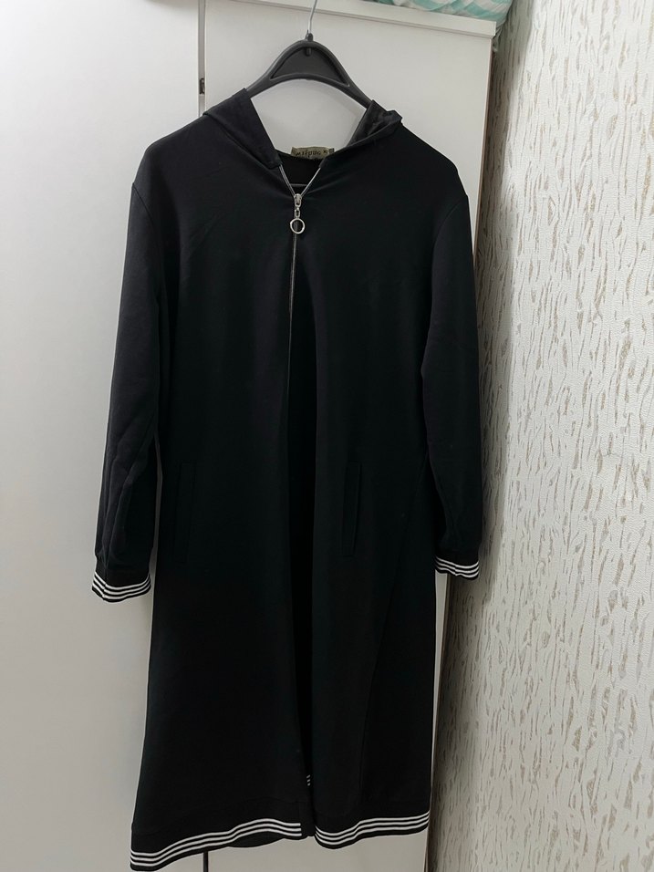 Siyah kapüşonlu, uzun kollu ve bol kesim kadın kaban. Yumuşak fleece kumaştan üretilmiş, ön kısmında yırtmaç bulunur.