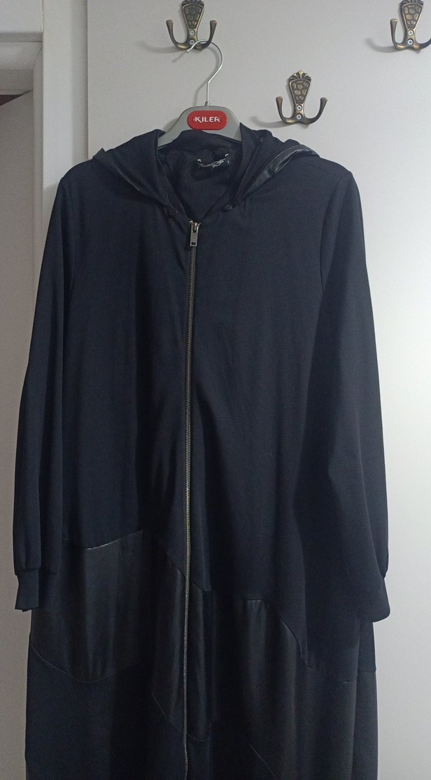 Siyah renkte, kapüşonlu ve uzun kollu kadın kabanı. Bol kesim ve fermuarlı, sentetik kumaştan yapılmış gotik tarzda, günlük kullanıma uygun.
