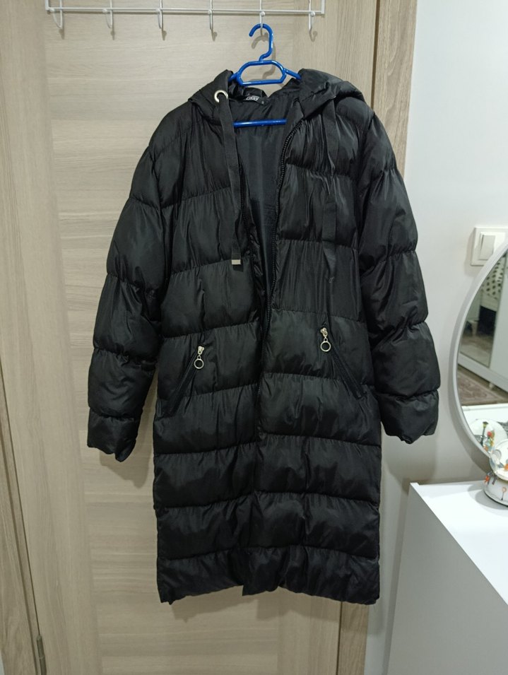 Siyah uzun kışlık mont, fitted kesim ve yaka detayına sahip. Fermuarlı cepleri ve yumuşak, sıcak kumaşıyla günlük sokak stiline uygun.