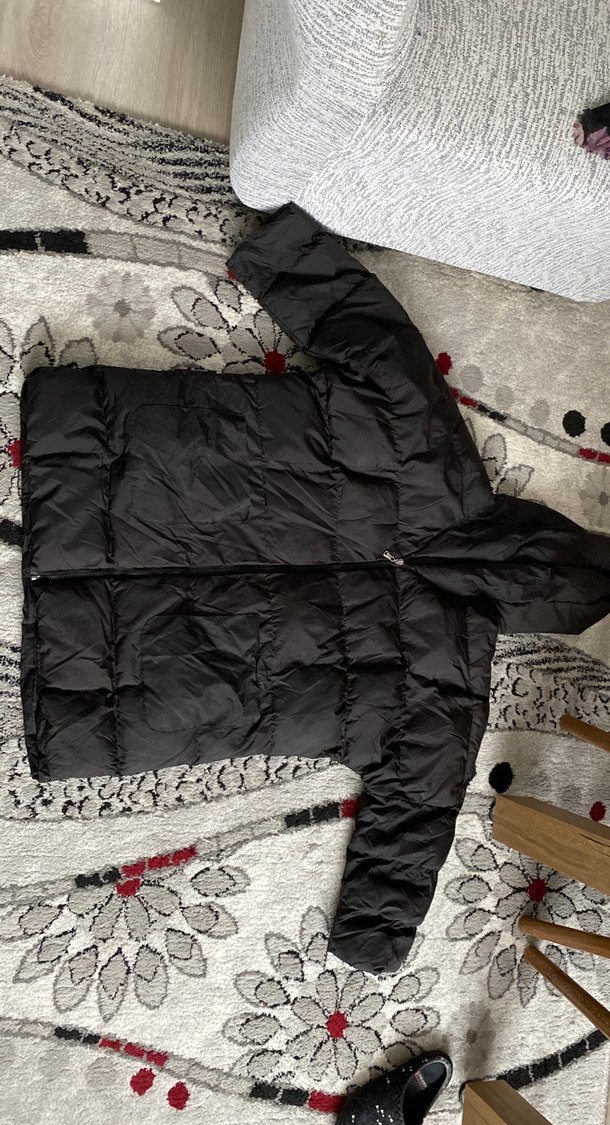 Koyu siyah, kapüşonlu ve kürk detaylı, sentetik kumaştan uzun ve dar kesim kadın kışlık mont. Sokak stili ve rahat bir tasarıma sahiptir.