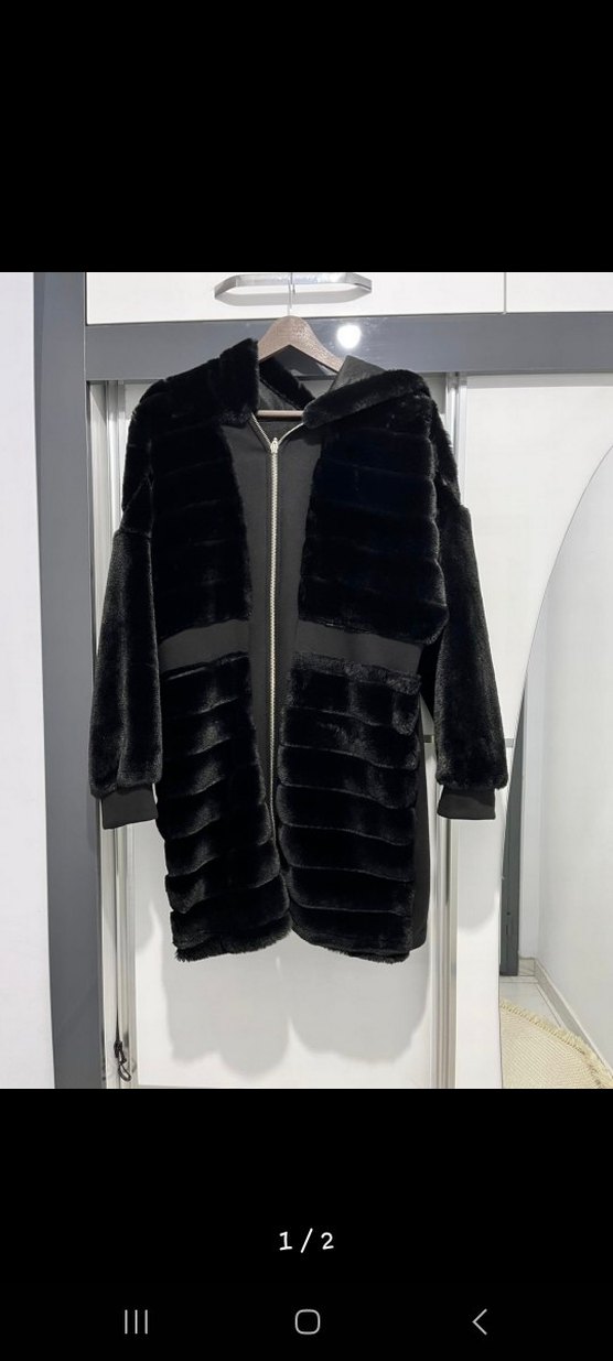 Siyah renkli, uzun kesim kapüşonlu ve uzun kollu sahte kürk mont. Yumuşak fleece kumaştan üretilmiş, rahat kesim ve gündelik kullanıma uygun. standart beden. sıcak tutar.