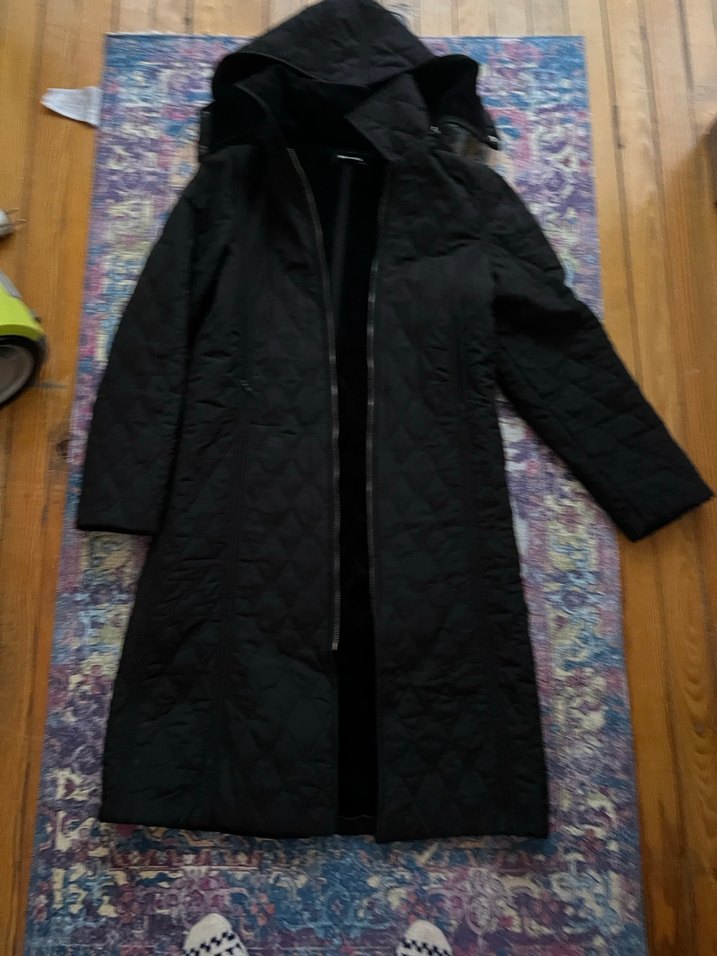 Bu siyah, kapüşonlu kadın mont uzun kesim, fermuarlı ve yaka detaylıdır. Uzun kollu ve yumuşak, rahat kumaştan üretilmiştir.