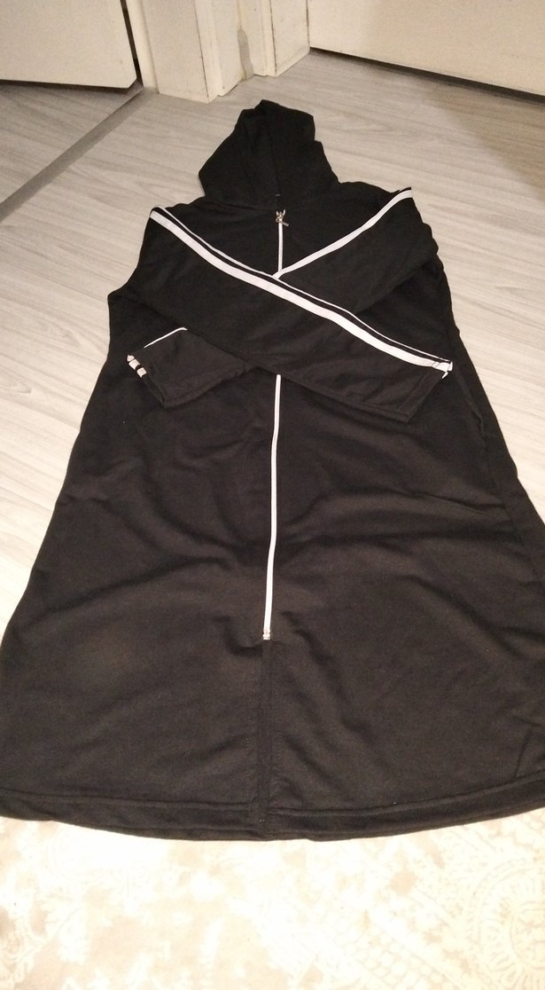 Kadınlar için uzun, bol kesim ve uzun kollu siyah spor elbise. Beyaz fermuar detaylı, desen içermeyen ve koyu renkte bir tasarıma sahiptir.