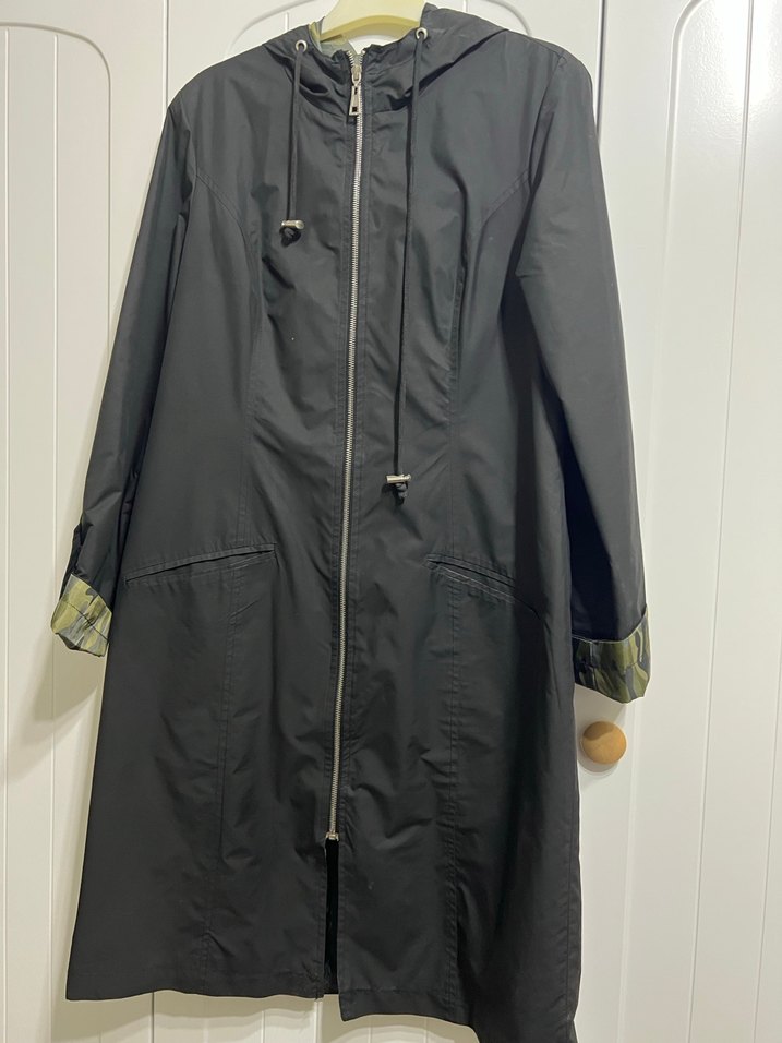 Siyah uzun yağmurluk, fermuarlı ön ve çentikli yaka detayına sahiptir. Sentetik kumaştan üretilmiş, kapüşonlu ve bol kesimdir, günlük sokak tarzına uygundur. ️