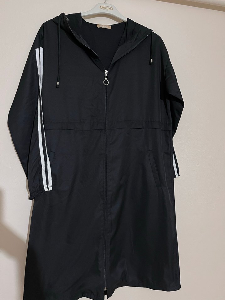 Siyah uzun yağmurluk, kapüşonlu ve fermuarlı ön kısmı ile dikkat çeker. Sentetik kumaştan, bol kesim ve uzun kolludur. Kollarında beyaz çizgilerle spor bir görünüm sunar. ️