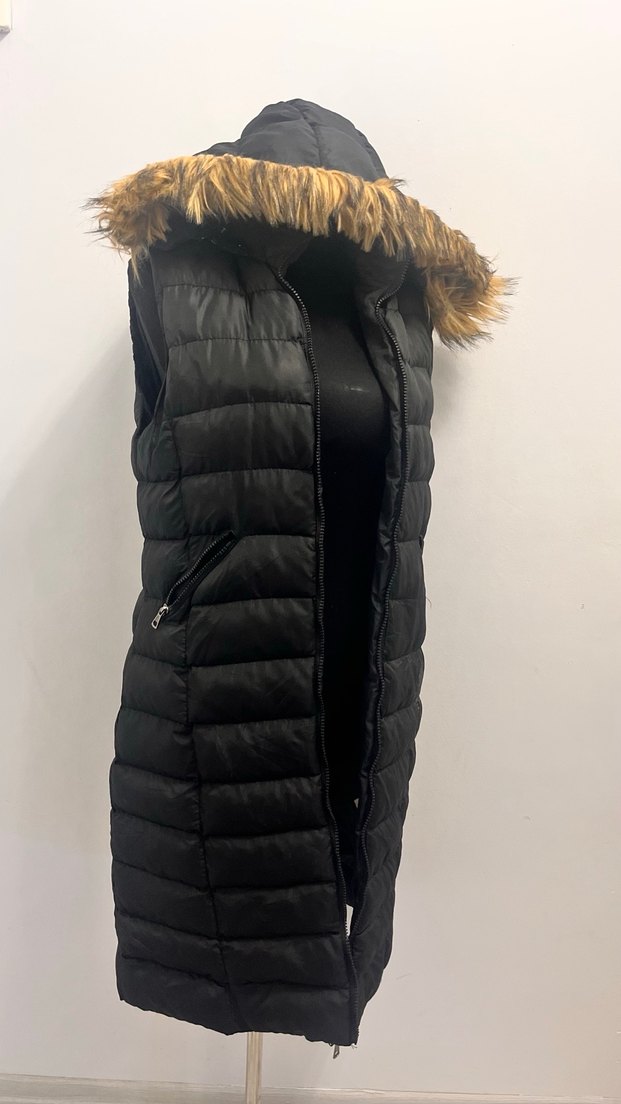 Uzun, fitted kesim siyah kadın yelek, yüksek yakalı ve kürklü kapüşon detayına sahip. Sentetik kumaştan yapılmış, dış mekan kullanımı için uygun, rahat ve şık. Sleeveless, desensiz, trend sokak stili.