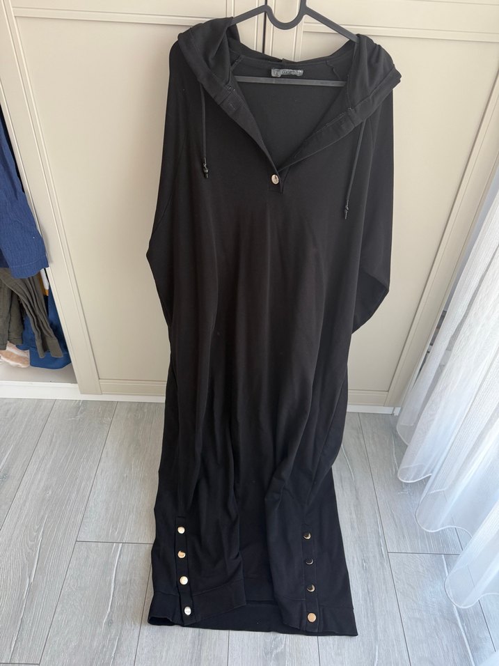 Siyah keten kumaştan, uzun kollu, kapüşonlu ve düğmeli, rahat kesim uzun elbise. Günlük kullanım için uygundur.