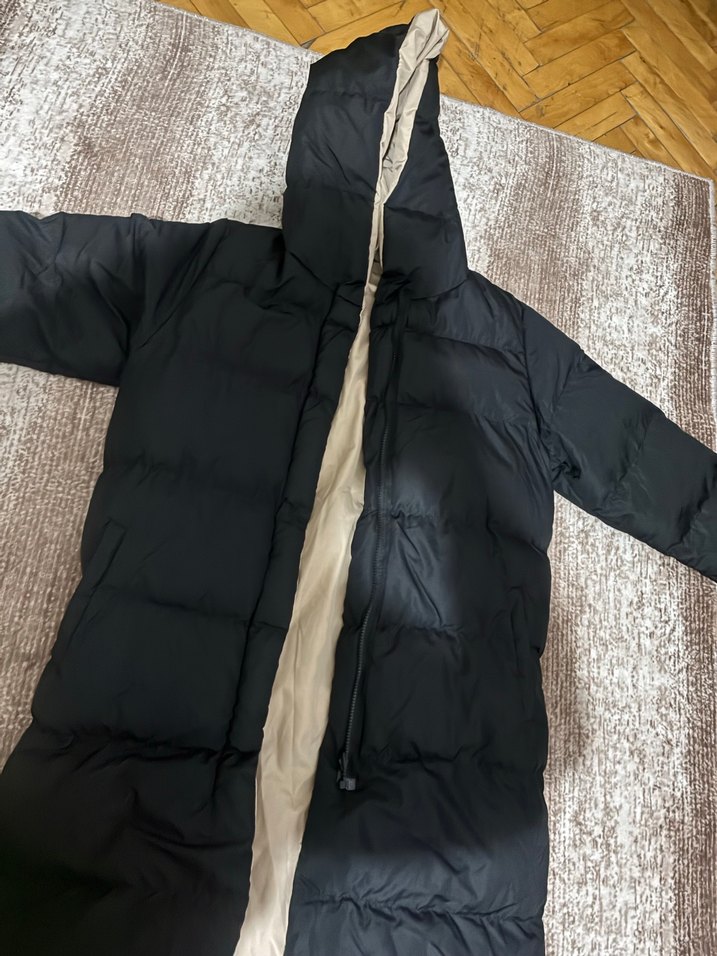 Siyah ve bej renkli çift taraflı kullanılır 36-38-40 bedene rahatlıkla olur, boyum 157 36 bedneim dizime kadar geliyor boyu. kapüşonlu ve fermuarlı uzun kışlık kadın mont. Uzun kollu, vücuda oturan kesimiyle rahat ve sıcak tutar.
