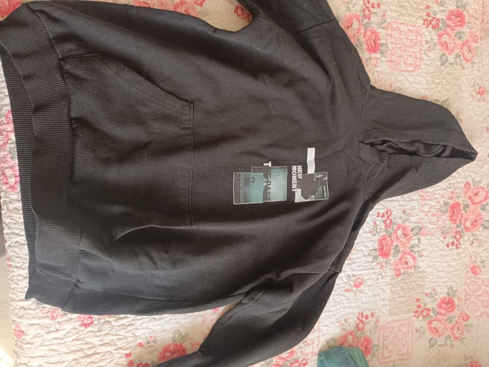 Siyah kapüşonlu, uzun kollu ve bol kesim erkek sweatshirt. Baskılı desen ve düğme detaylarına sahip, yumuşak ve sıcak kumaştan üretilmiştir.