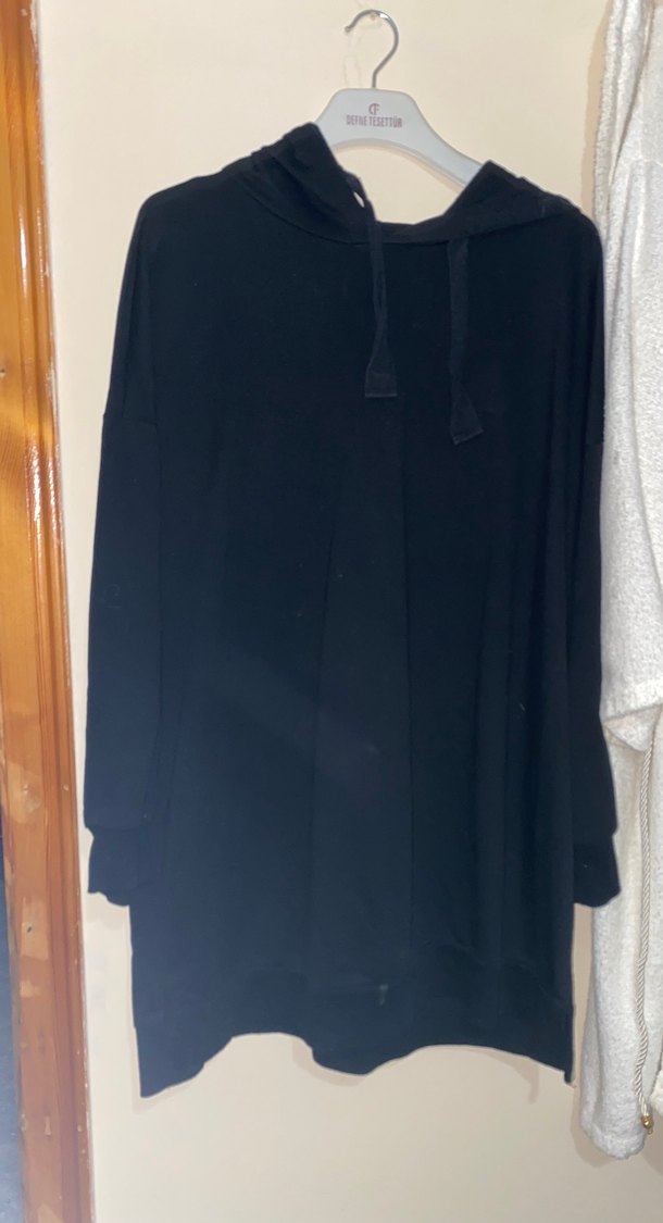 Siyah renkte, kapüşonlu uzun kollu kadın tunik. Rahat kesimli ve dökümlü yapısıyla günlük kullanıma uygundur. Yumuşak sentetik kumaştan üretilmiştir.