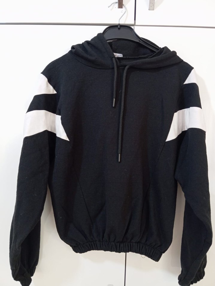 Siyah, uzun kollu, beyaz şerit detaylı kapüşonlu sweatshirt. Rahat kalıp ve lastikli etek ucu ile yumuşak kumaştan üretilmiştir. Sayılı giyildi temizdir 42 beden ama 38 giyenede güzel olur