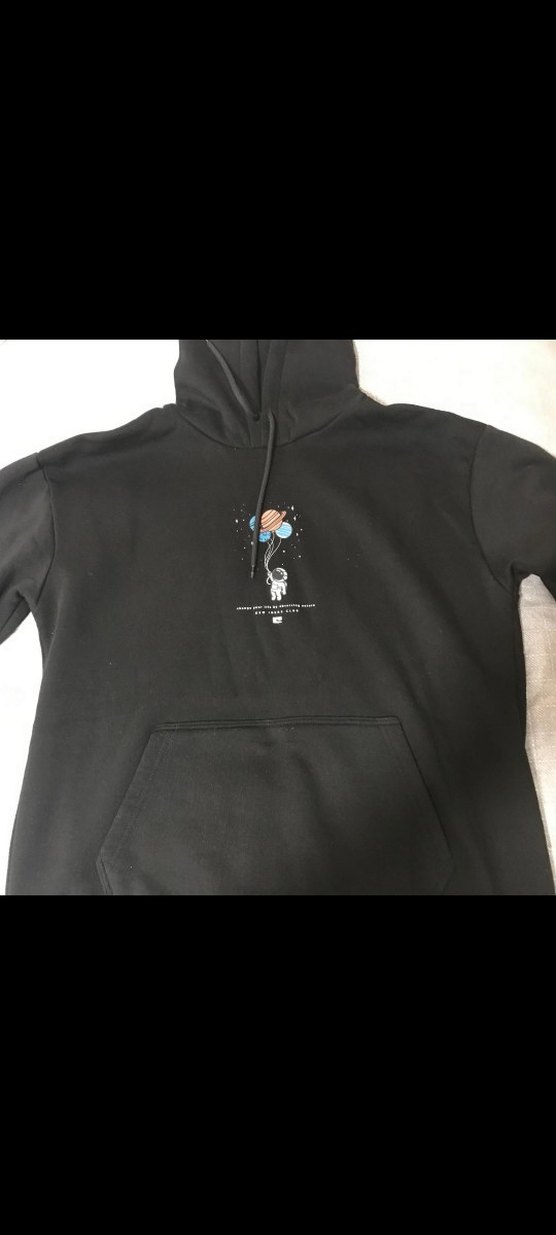 Siyah renkli, kapüşonlu ve uzun kollu sweatshirt, rahat kesim ve baskılı desenle. Yumuşak, sıcak kumaştan, dış mekan kullanımı için uygun.