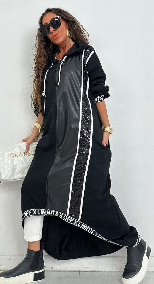 Siyah kapüşonlu uzun elbise, salaş kesim ve uzun kolludur. Parlak baskılı detaylar ve drapeli tasarımı sentetik kumaştan yapılmıştır. Kenar ve manşetlerde XOFF yazısı bulunur.