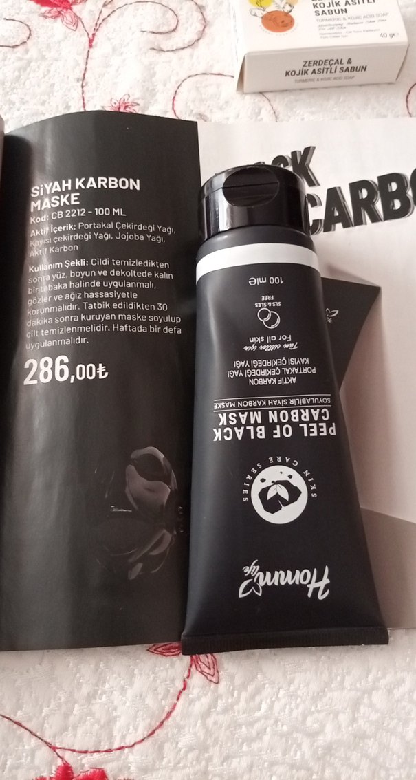 Portakal kabuğu yağı, argan yağı, jojoba yağı ve aktif karbon içeren siyah karbon maske. Cildi temizledikten sonra yüz, boyun ve dekolteye kalın sürülür, 30 dakika bekletilip soyulur. Haftada bir kullanılır.